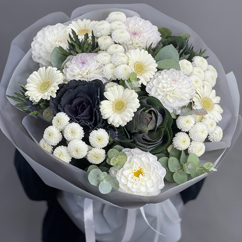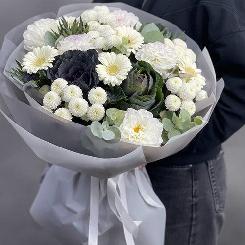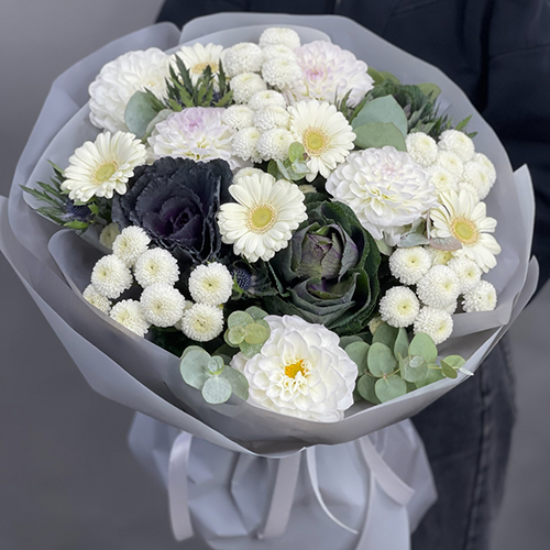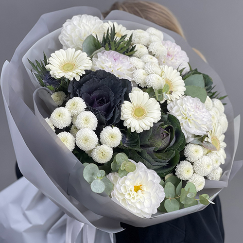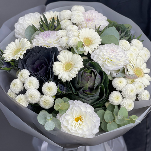 Букет "Белоснежная нежность" из георгин, брассики, хризантем Ньютон, эрингиума и гербер