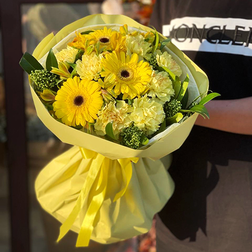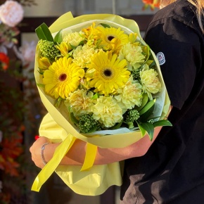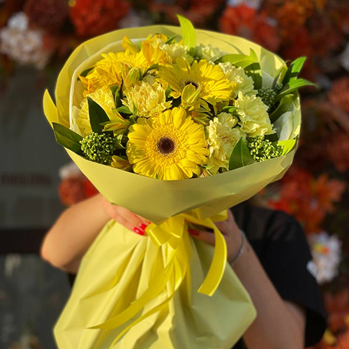 Букет "Солнечная пора" из гербер, альстромерий, скиммии и диантусов