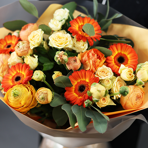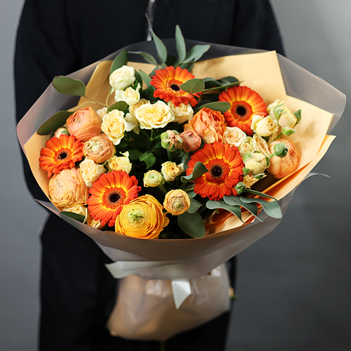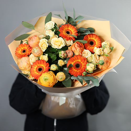 Букет "Утомлённое солнце" из ранункулюсов, гербер и кустовых роз