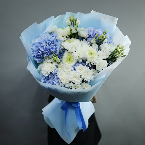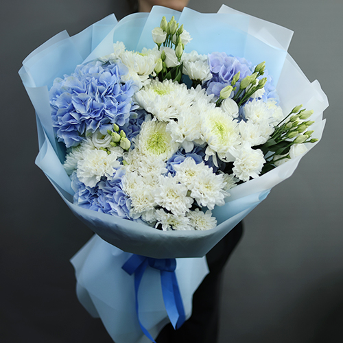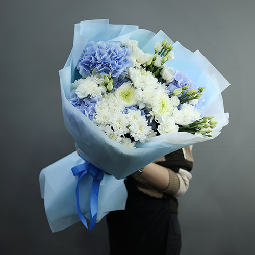Букет "Океан любви" из Голландских гортензий, диантусов, хризантем Магнум и эустом