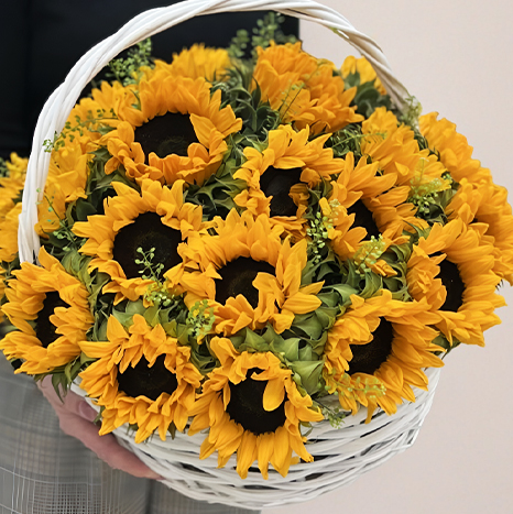 Композиция в корзине из 29 подсолнухов