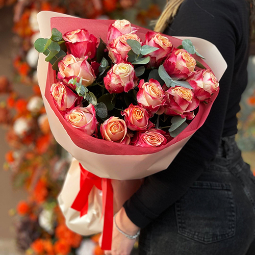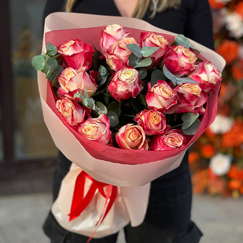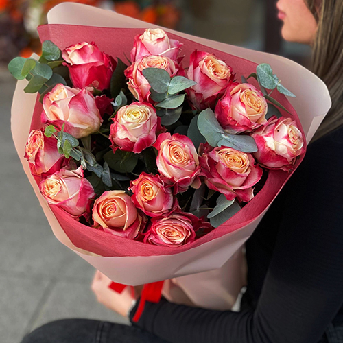 Букет из 15 роз Кения с эвкалиптом (50 см)