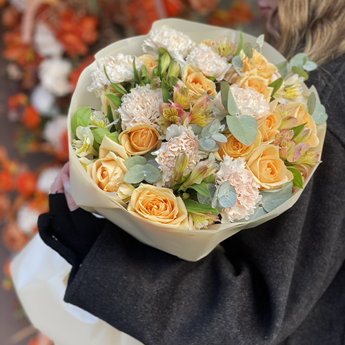 Букет "Пломбирный" из роз Аваланж, диантусов, альстромерий и эвкалипта